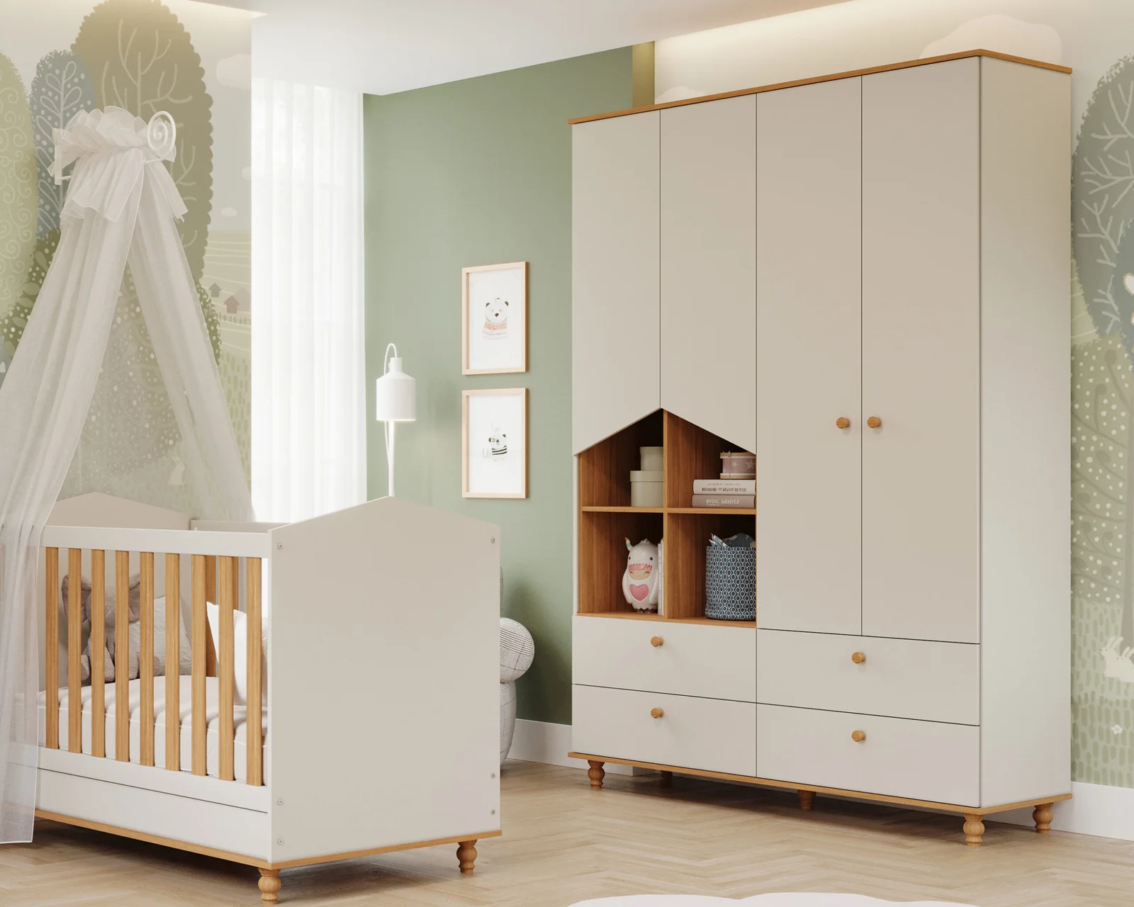 Com 4 portas, 4 gavetas espaçosas, e 4 nichos para objetos decorativos, o Roupeiro Casinha oferece muito espaço para as roupas e brinquedos do seu pequeno tesouro.