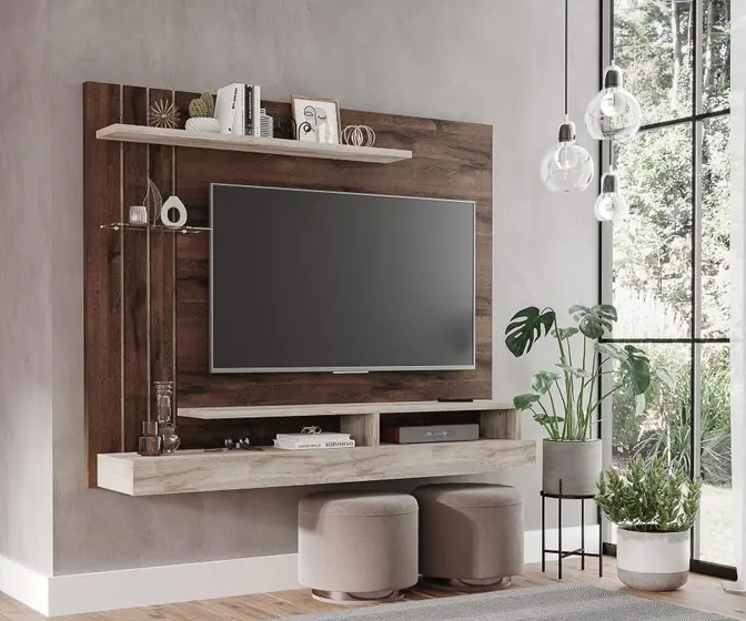 Possui espaço para TV de até 50” e uma prateleira superior robusta com 2,5cm para objetos decorativos.